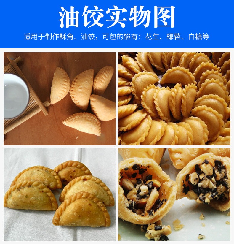 自动成型油饺机,创业商用、省时省力。适用于制作酥角、油饺。3000-4000每小时大产量。省力快速,做酥角、油饺的神器。自动撒粉 不粘机器。面粉均匀漏下,面皮不粘黏机器。